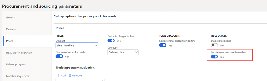 In Procurement and sourcing > Setup > Procurement and sourcing parameters > Prices, there is a new “yes/no” toggle to indicate whether or not the system will “Update open purchase lines when trade agreement price is updated.” When toggled to “yes,” the batch job update functionality will run.