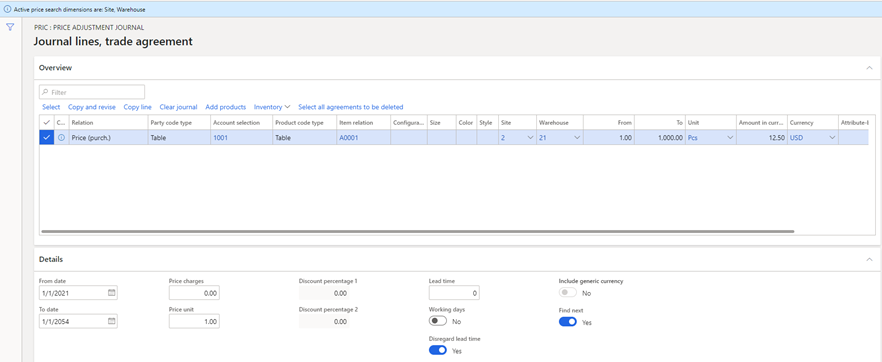 Example: A purchase price trade agreement journal that applies to vendor 1001, item A0001 for a line quantity of 1 to 1000, and any date from 1/1/2021 through 1/1/2054. The agreement sets the purchase price at $12.50.