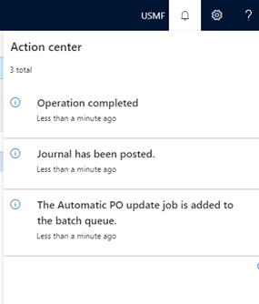 Once posted, the batch job will run (if the toggle in the parameters above is set to “yes”) and will look for applicable purchase order lines to update. The user will see several actions indicating that the job has run: