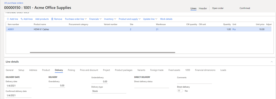 Example: There is a PO line for vendor 1001, item A0001, with a confirmed delivery date of 1/4/2021 and a price of $10/unit. The PO has been confirmed, and there is no receipt against the line.