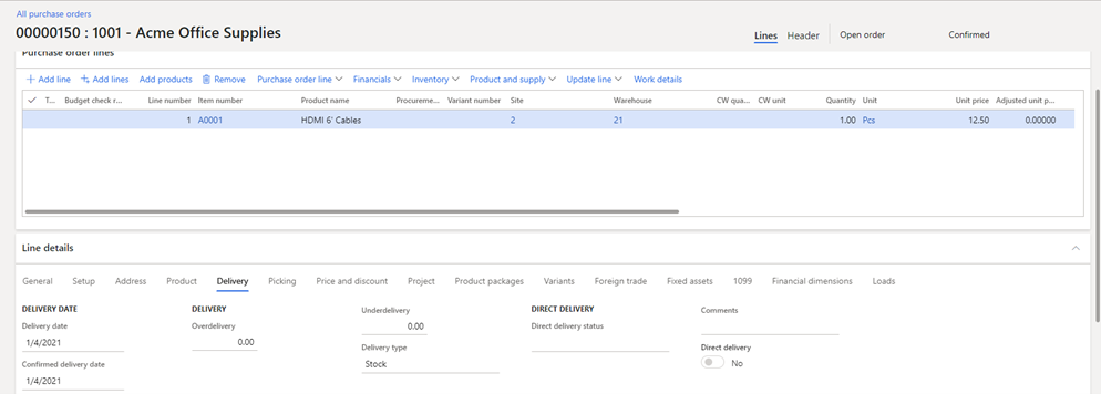 After the trade agreement update (above) runs, the purchase order gets updated to reflect the new unit price of $12.50. It’s updated because the vendor, item, site, and warehouse match, the line quantity of 1 and the confirmed delivery date of 1/4/2021 are within the ranges defined on the trade agreement.