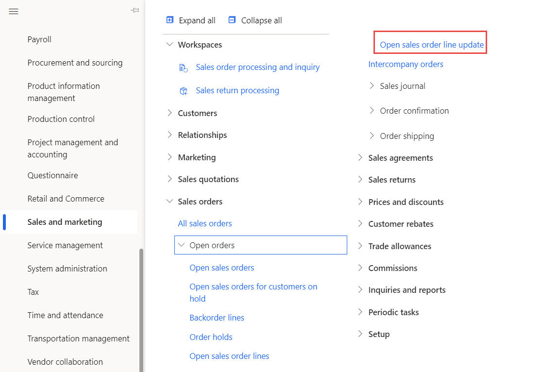 The user navigates to the form via Sales and marketing > Sales orders > Open orders > Open sales order line update.