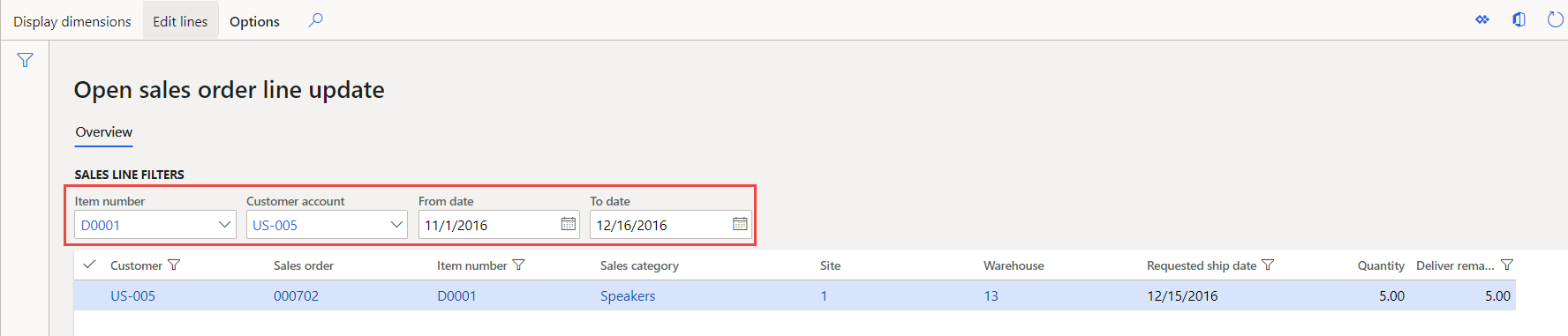 - The combination of filters/lines selected will impact the fields that are available to update for the form. For instance, if the user selects lines of Sales orders for multiple customers, the fields impacting delivery location and method aren’t editable since the values will likely be different.