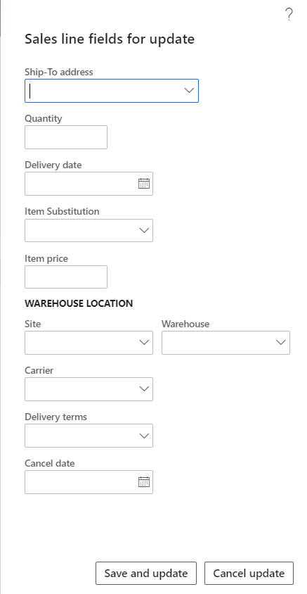The fields available to edit pop up, and the user populates the value(s) that they want to update on the selected lines. The user can update the Ship to address, line Quantity, Delivery date, substitute the Item, Item price, Site, Warehouse, Carrier, Delivery terms, and Cancel date. To update, the user selects “Save and update” at the bottom of the page, or they can cancel the update(s) by selecting “Cancel update.”