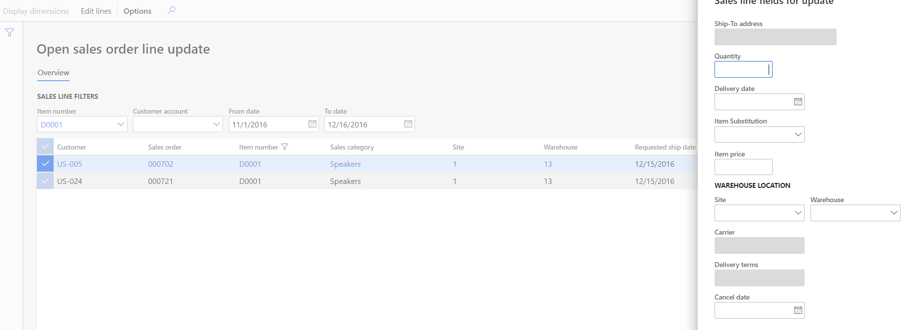 Out of the box, the user can update sales order lines, but it’s time consuming and doesn’t allow for updates to multiple fields at once across lines. Additionally, to do an item substitution, the user would need to delete the line and add a new one with the new item.